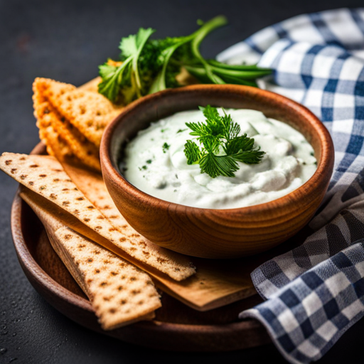 거른 요거트, 간 오이, 마늘, 레몬주스, 딜 또는 민트로 만든 크리미 한 그리스 딥입니다.