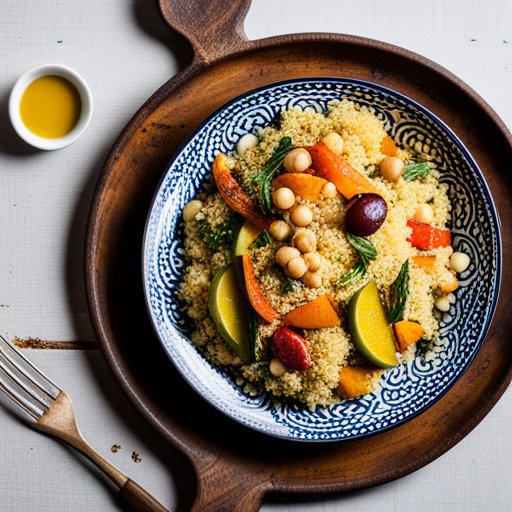 푹신한 쿠스쿠스에 구운 야채, 병아리콩, 올리브 오일을 뿌린 요리입니다.