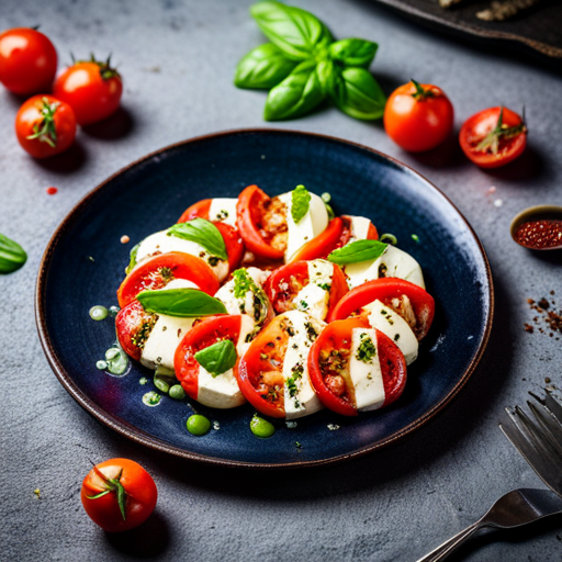 신선한 모차렐라 슬라이스, 잘 익은 토마토, 신선한 바질 잎을 발사믹 글레이즈와 올리브 오일로 뿌린 정통 이탈리아 샐러드입니다.